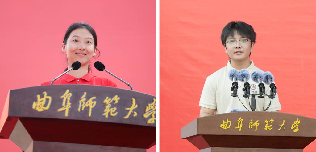 校友代表张强教授和刘峰教授为新生送上祝福。张强鼓励同学们敢于探索,勇于尝试,追求真理,开拓创新,保持好奇心,心怀爱国之情,笃行报国之志,将个人理想与国家命运紧密相连,在时代的浪潮中书写属于自己的闪光青春。刘峰首先祝贺各位新同学迈入曲阜师大这所文化底蕴浓厚的高等学府,分享了自己求学奋斗的心得,勉励同学们志存高远,脚踏实地,真抓实干,守正创新,在美丽曲园不负韶华、奋力逐梦。